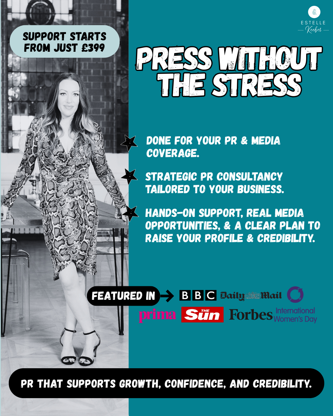 I’m Estelle Keeber, a visibility and PR consultant who helps businesses, founders and personal brands get featured in the media without the stress, guesswork or constant chasing.